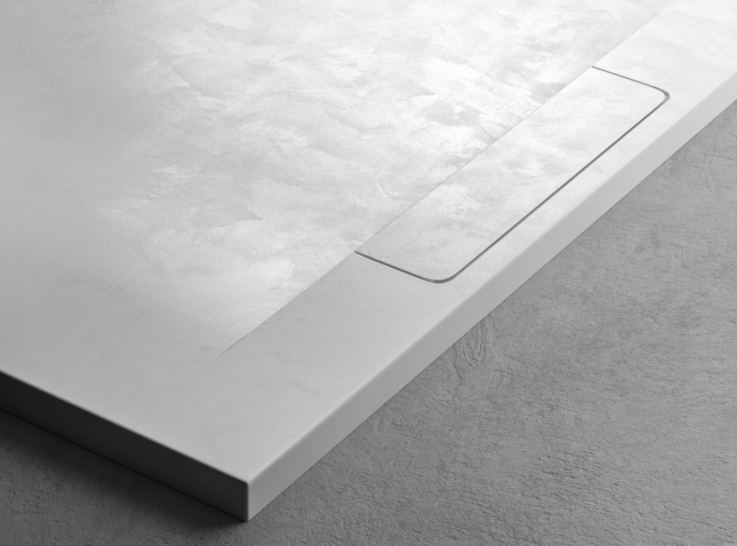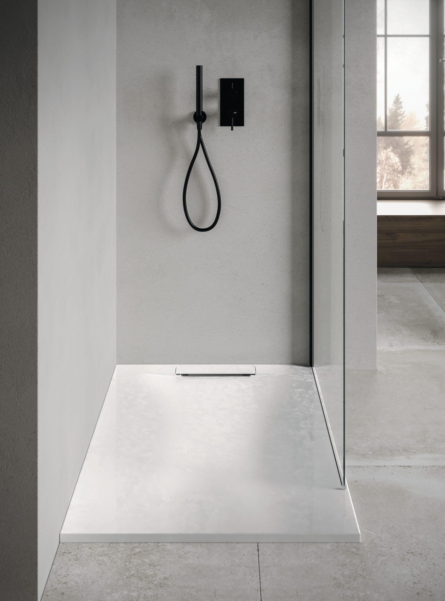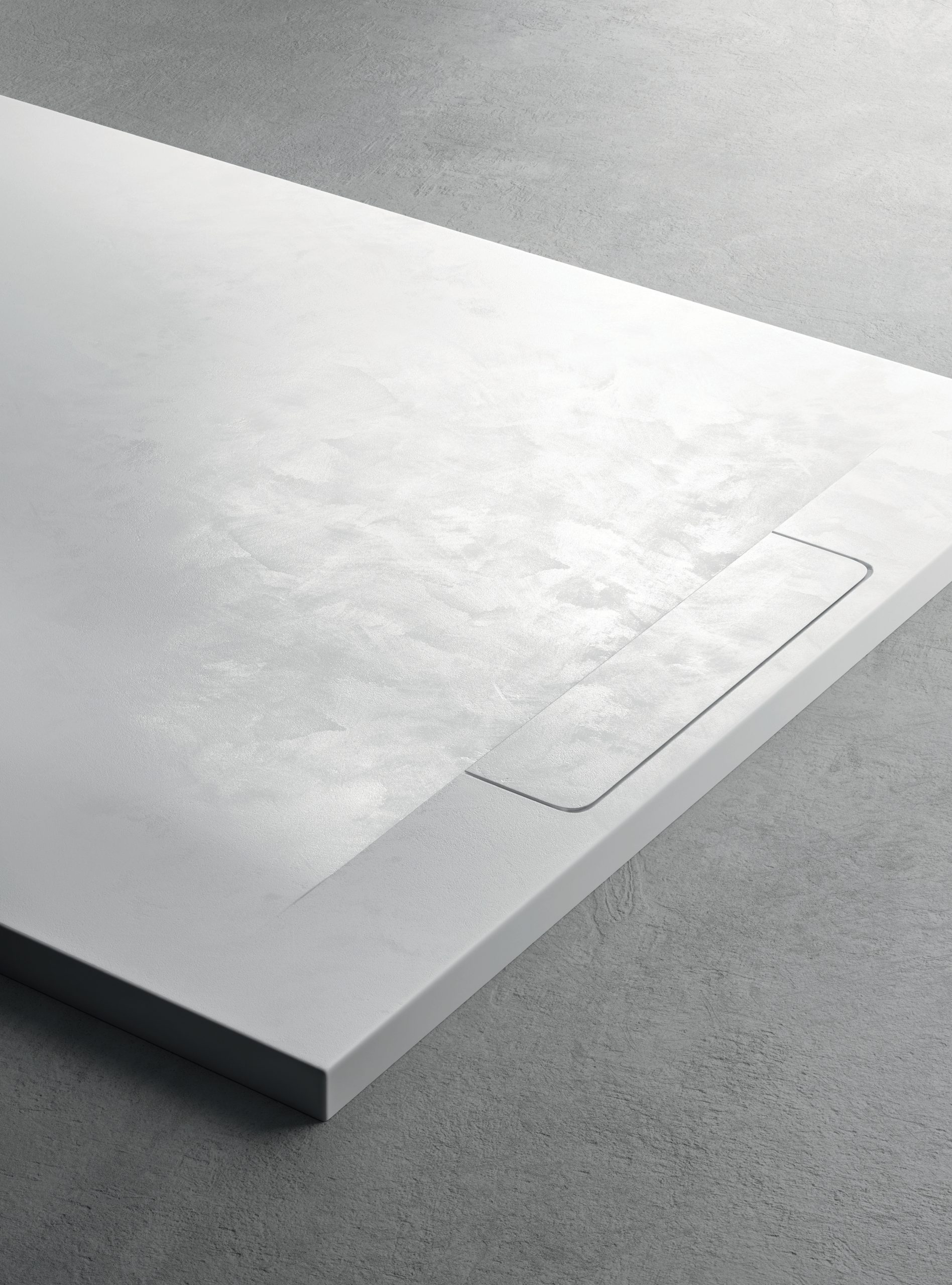 Outre la sécurité, Mark mise sur une fonctionnalité extrême : la surface est antibactérienne, anti-taches et anti-gouttes, garantissant hygiène et facilité d’entretien au fil du temps. Grâce à sa polyvalence technique, le receveur de douche peut être facilement découpé sur place, s’adaptant avec une précision millimétrique à toute exigence architecturale ou à toute configuration irrégulière de l’espace douche.