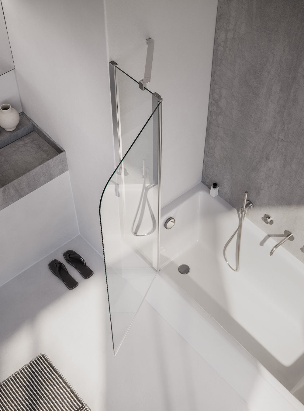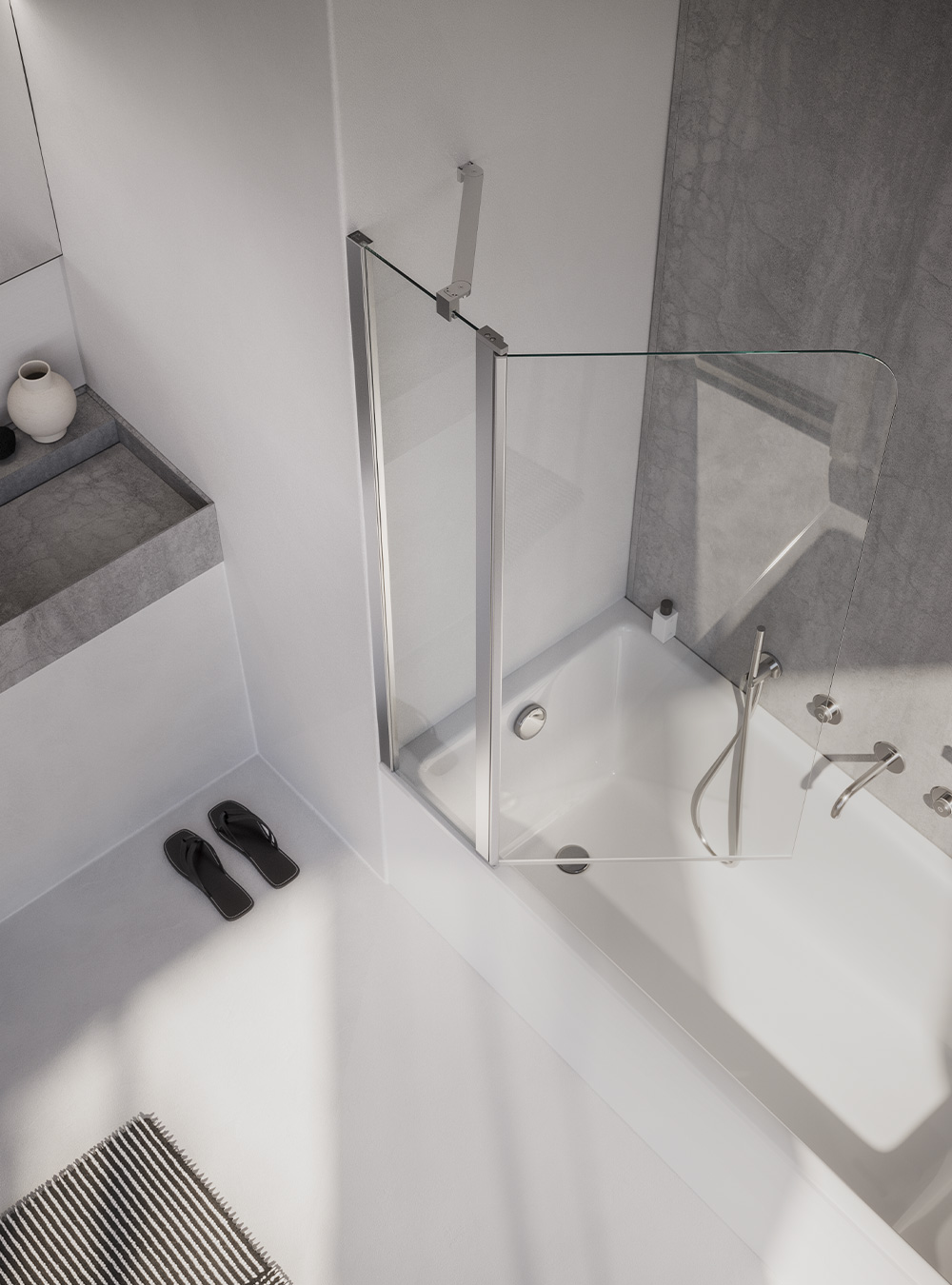 Sopravasca coin avec charnière avec méchanisme de levage pendant l'ouverture + paroi fixe alignée, disponible sur mesure, brac au 45°.