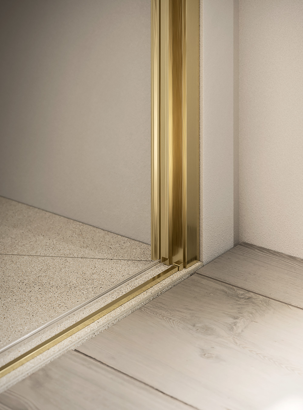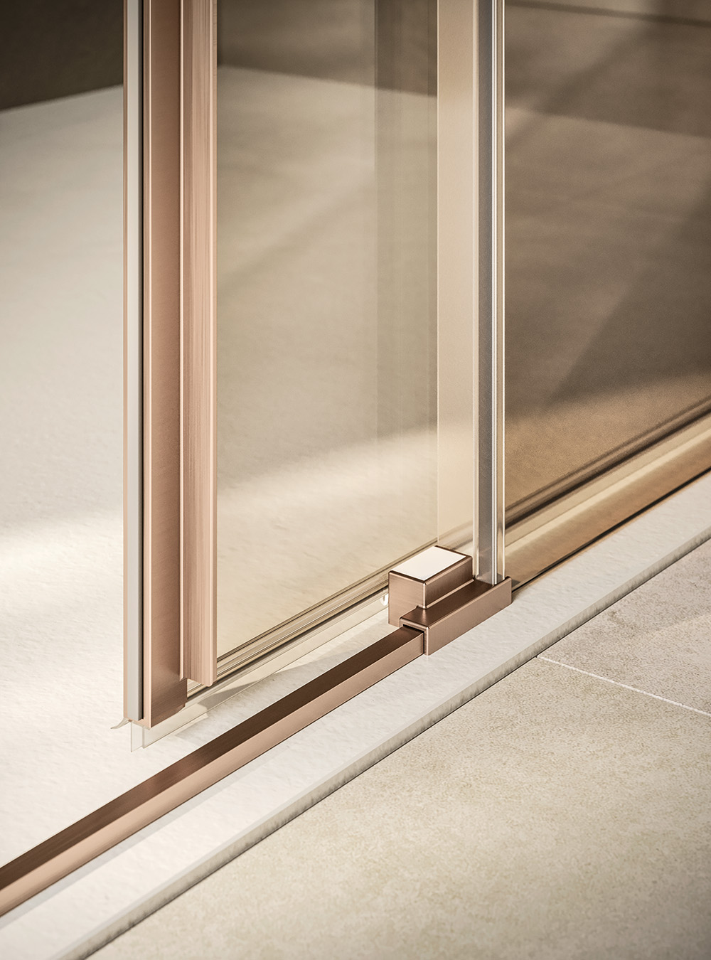 dans la configuration avec deux portes coulissantes, les profilés sont coupés à 45 à pour obtenir une jonction minimaliste.