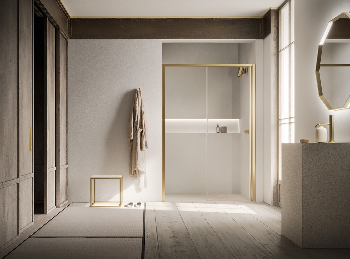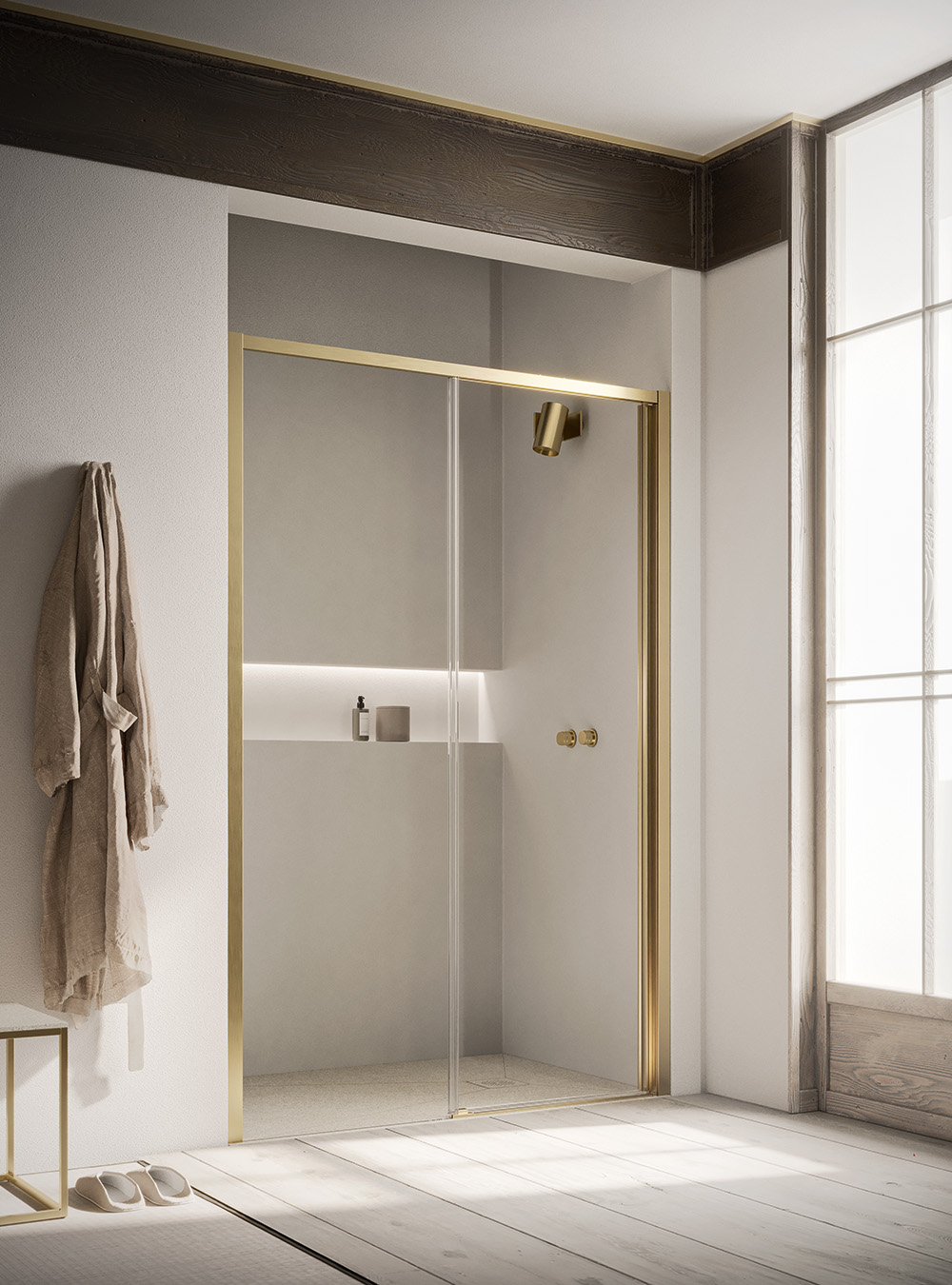 VENTO Porte coulissante avec paroi fixe alignée + paroi fixe latérale façonnée